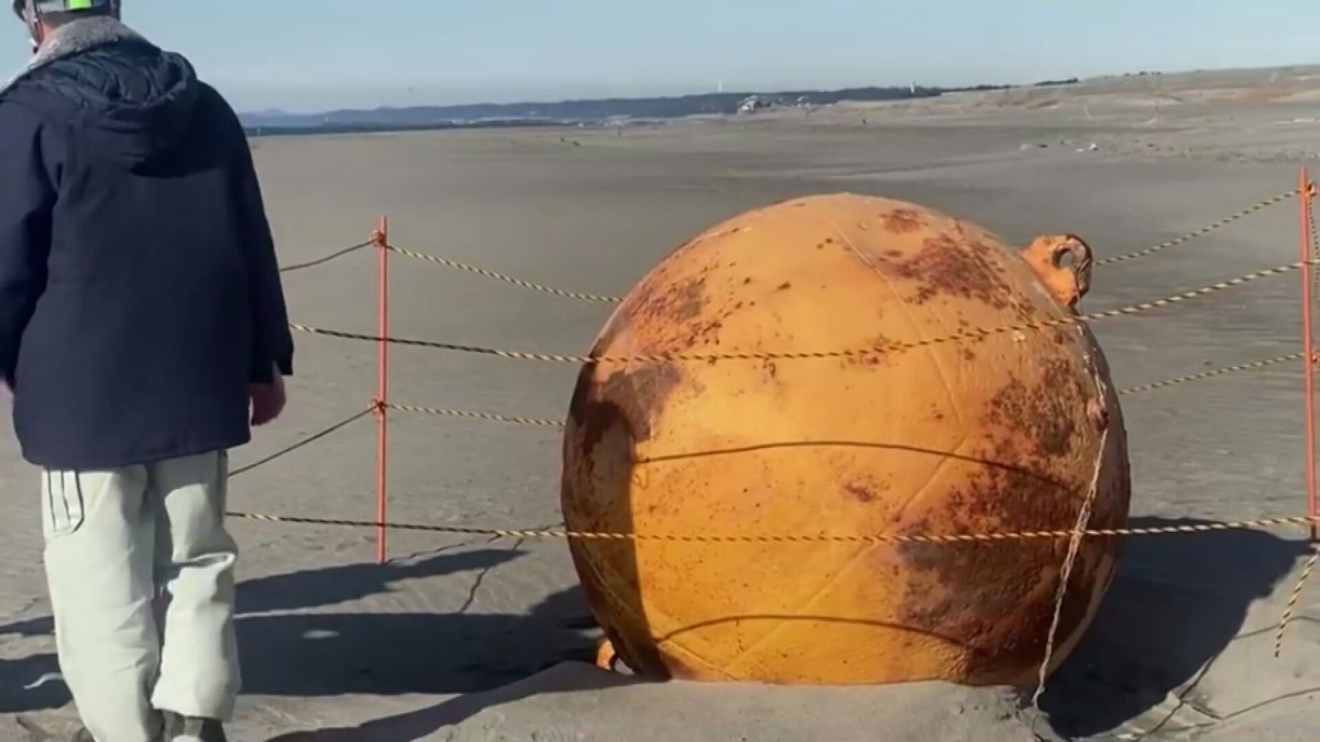 Police and the bomb squad were called in to investigate the sphere, which is about 1.5m in diameter, after a woman spotted in on the beach in the city of Hamamatsu.